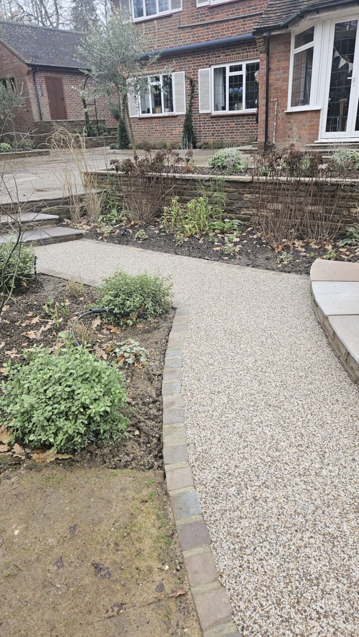 Legacy Installers Glenco recently completed a high-quality resin bound pathway installation in Gerrards Cross, using SureSet ProResin combined with 6mm Bronze natural aggregate. The project delivered a durable, permeable, and visually striking pathway designed to enhance the property’s outdoor space while offering long-term performance and minimal maintenance.